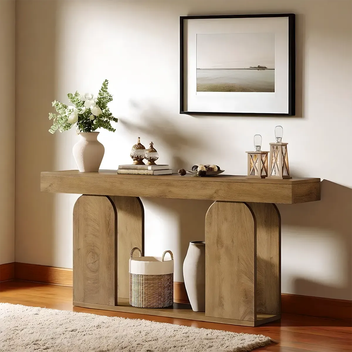 The form is elegant from every angle. The underside remains open for storage baskets or a narrow bench and the edges of the top are refined for comfort during daily use. Floor friendly pads protect surfaces and allow simple adjustments on rugs. Because the design is calm it can sit under a gallery wall or support a mirror without competing for attention.